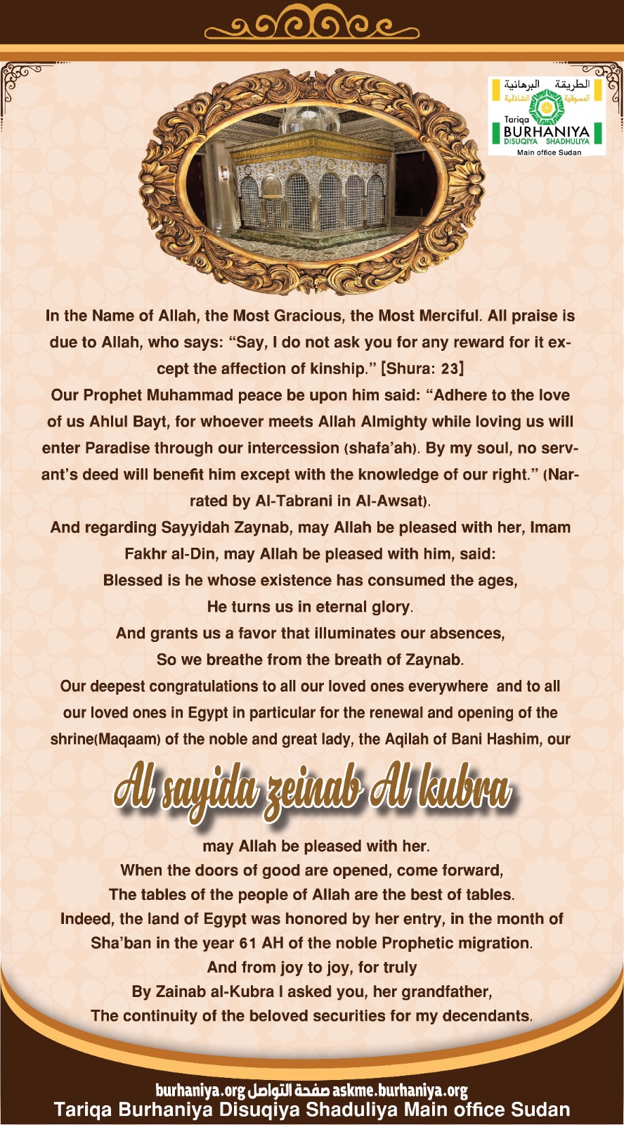 تهنئة افتتاح مقام الكريمة سيدتنا السيدة زينب رضى الله تبارك وتعالى عنها