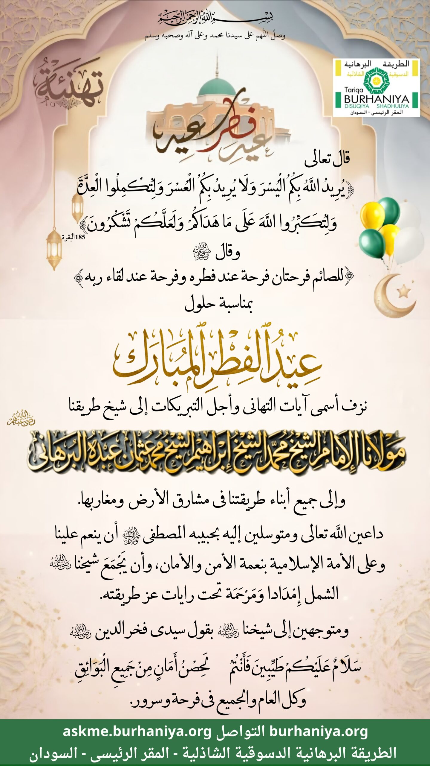 هذا هو الموقع الرسمى الوحيد للطريقة البرهانية الدسوقية الشاذلية باللغة العربية والطريقة غير مسئولة عن أى موقع آخر يحمل أى اسم مشابه أو عما يتم نشره بإسمها أو بإسم مشايخها أو أى مقالات أو أفلام أو صور أو أى موضوعات أخرى على أى موقع أو منتدى أو جروب أو صفحات نت عامة أو شخصية.