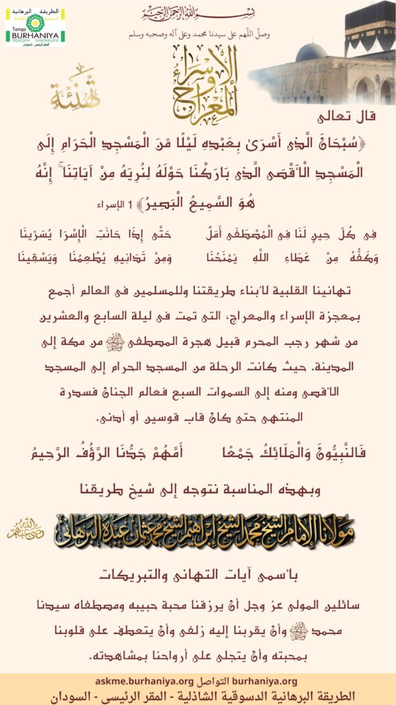 تحت شعار سَلَامٌ أَبَا الْعَيْنَيْنِ حِبَّ مُحَمَّدٍ تحتفل الطريقة البرهانية الدسوقية الشاذلية أبناء الشيخ / محمد عثمان عبده البرهاني بحولية القطب الأمجد بحر الورود والبركات…