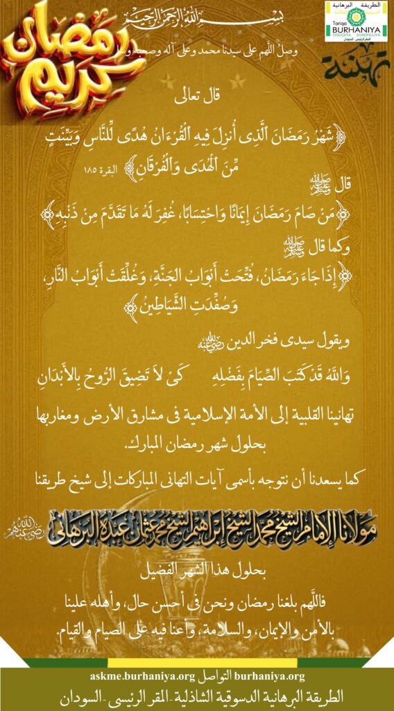 تهنئة فضيلة مولانا الإمام الشيخ محمد الشيخ إبراهيم الشيخ محمد عثمان عبده البرهانى رضى الله عنهم بحلول شهر رمضان المعظم 1446 هـ – 2025 م