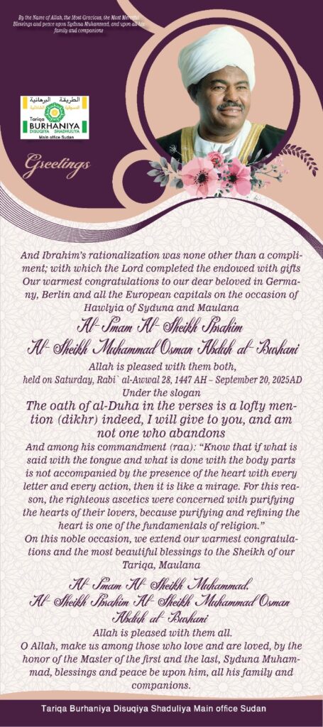 تهنئة بحولية فضيلة سيدنا ومولانا الإمام الشيخ إبراهيم الشيخ محمد عثمان عبده البرهانى رضى الله عنهما بألمانيا وجميع العواصم الأوربية