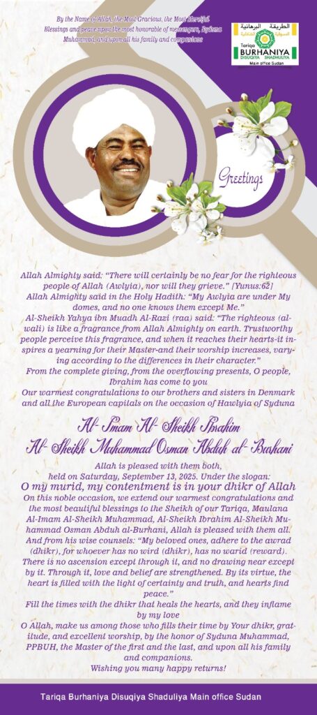 كل عام وأنتم بخير بمناسبة حولية فضيلة مولانا الإمام الشيخ إبراهيم الشيخ محمد عثمان عبده البرهانى رضى الله عنهما بالدنمارك وكل العواصم الأوربية
